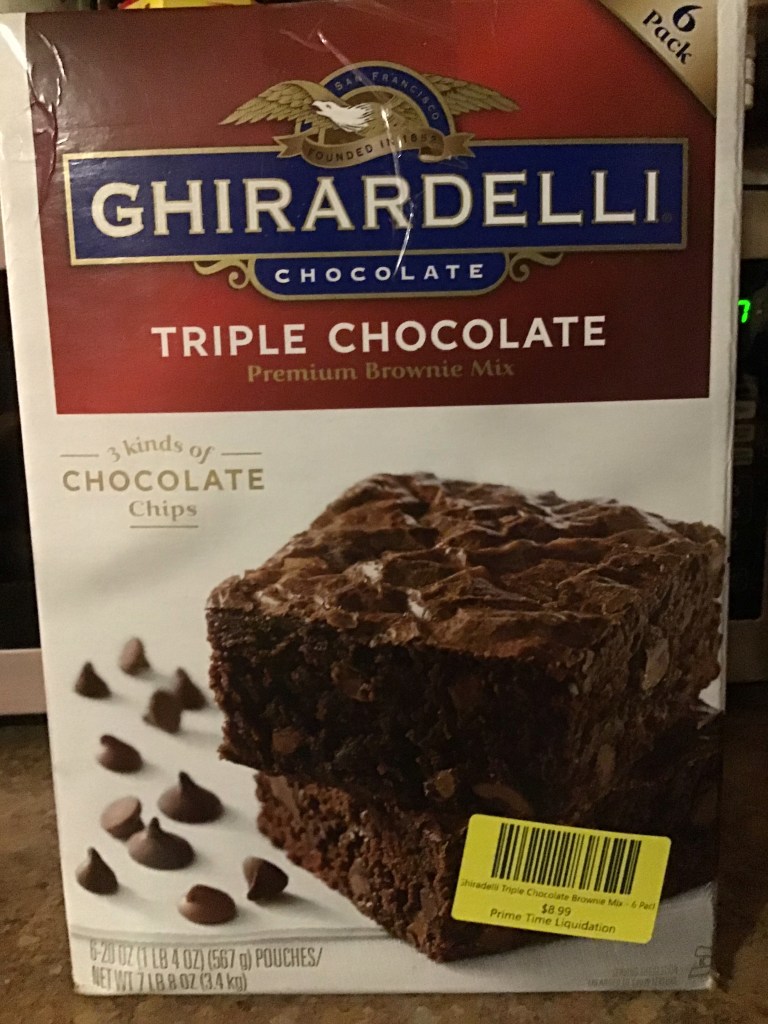 I found this gem at a liquidation store that we have in our small town. I bought two big boxes for a little under $20. I was thrilled. Triple chocolate at a bargain is utter food orgasm. That is twelve batches of brownies.