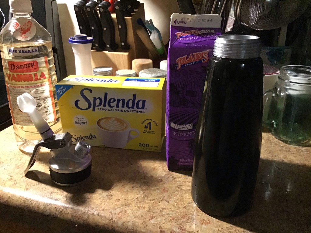 For Christmas he ordered me a CO2:cartridge whip cream dispenser. It is so easy to use. I store it in the fridge. I put about a cup of heavy cream, a teaspoon of Mexican Vanilla and package of Splenda into the canister. I put the contraption together, put in the cartridge and shake a little bit. I have instant whipped cream. The flavor is heavenly and it makes him feel so very spoiled.
