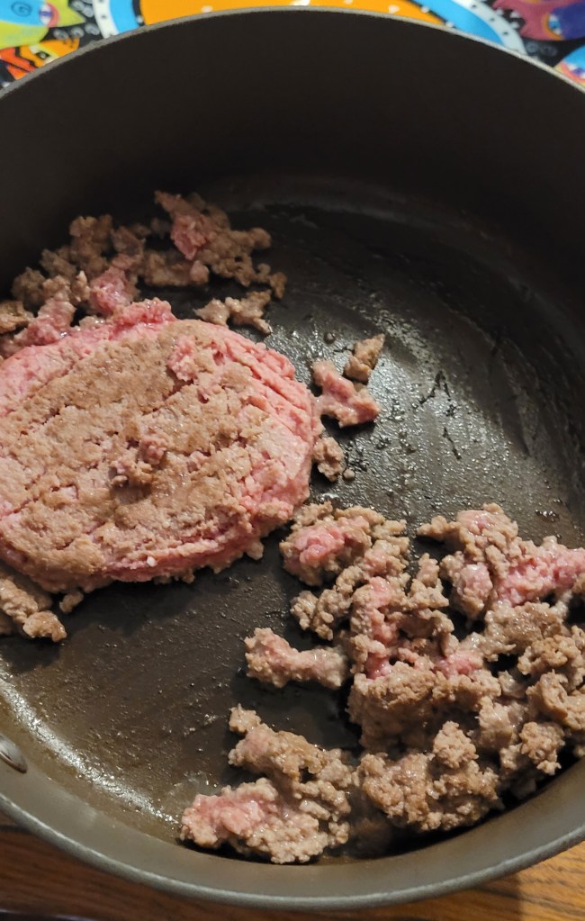 I brown a pound of hamburger and then add some frozen onions.