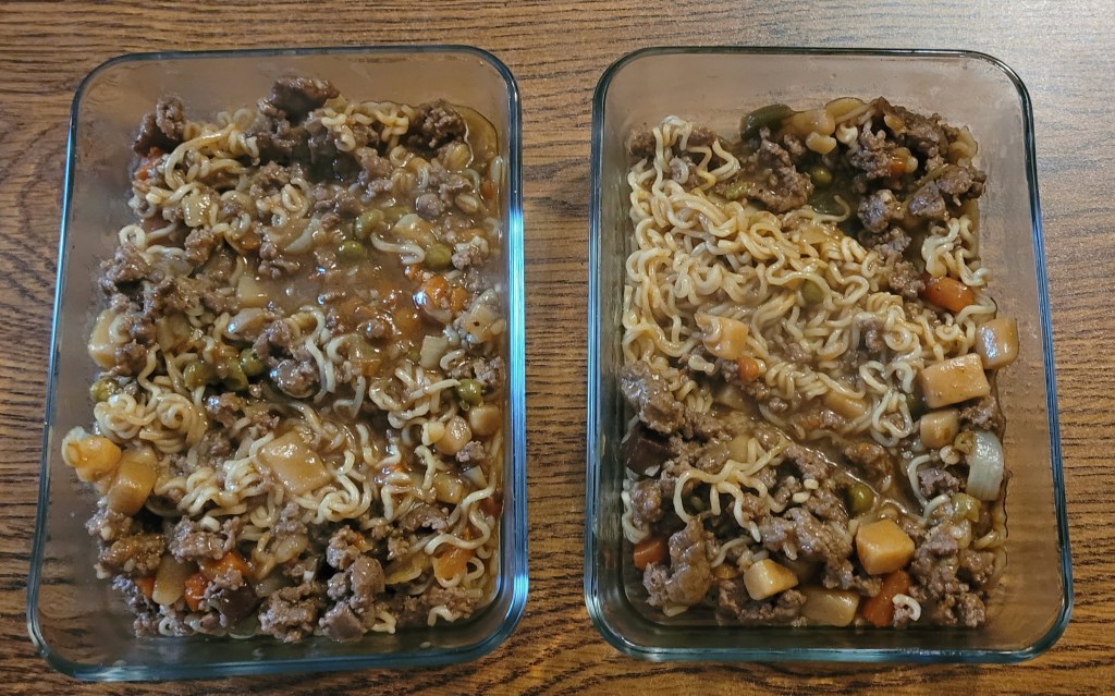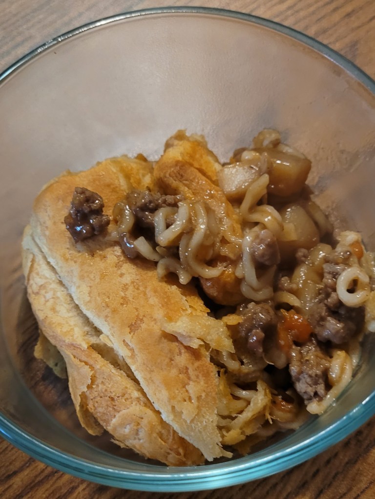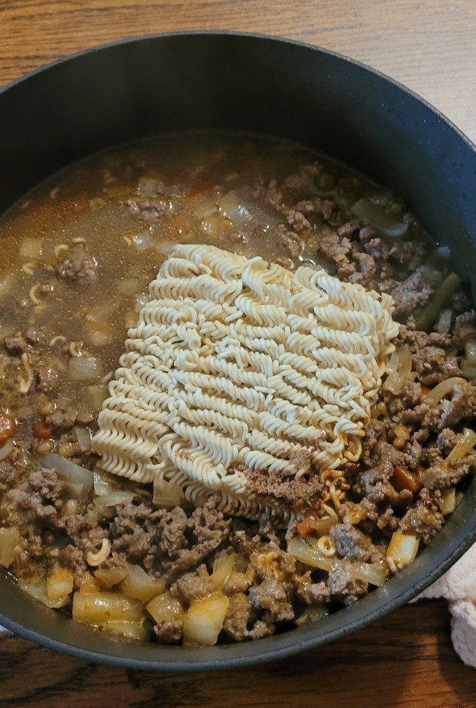 I add a can of vegetable neef soup, a can of water, and a package of beef ramen noodles. If you have beef bullion add a cube to the mix.