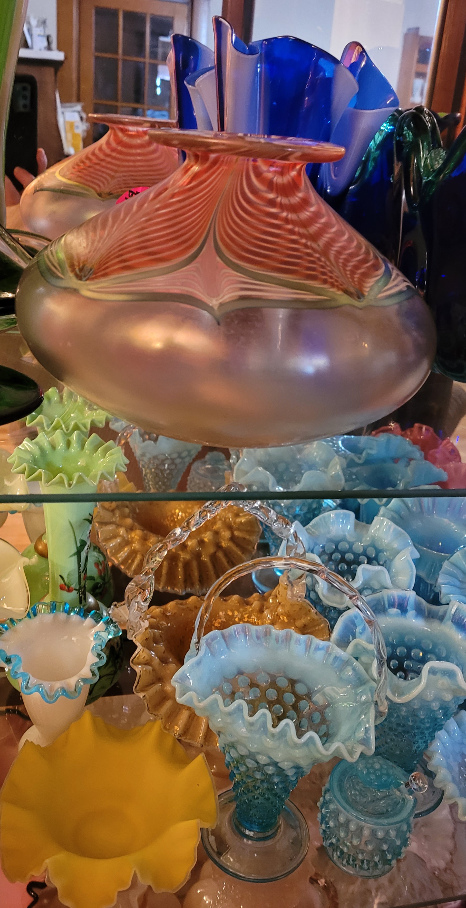The treasures I found: wonder under, iron on transfers, old wooden thread spools, a beautiful blue vase, depression glass, a cute coffee mug, ice cream dishes, a rusty primitive art candle holder, a floral picture, and a bakers rack.
