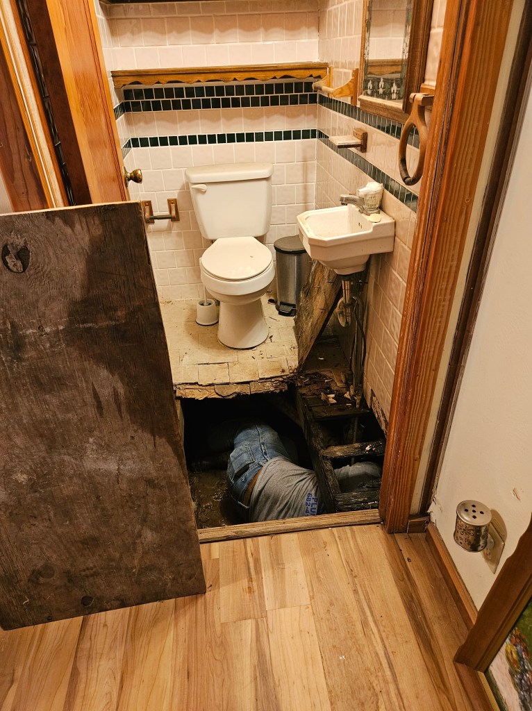 Chuck has been gone almost two years now. I just recently had the house leveled. I experienced a cracked pipe in that floorless bathroom but just don’t use the sink.