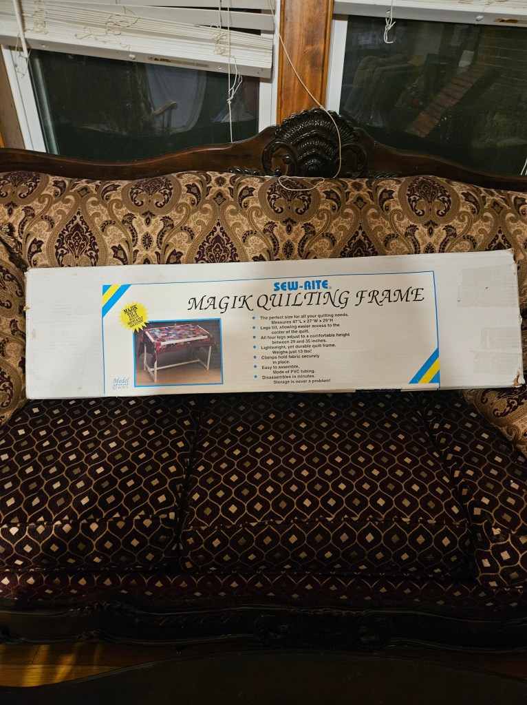 I have been sick with the flu since my birthday. I finally got myself out of bed and decided to go treasure hunting. I did not find any estate sales worth going to. I went to a nearby town and found a nice resale shop. I found this quilt frame in a box. I have been wanting one like this for a long time.