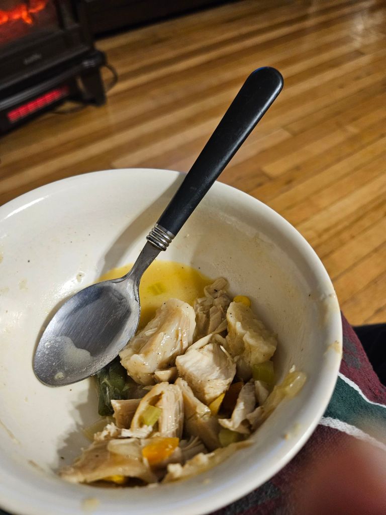 Tonight I made chicken and dumplings. I had purchased a baked chicken on grocery day. I had a meal from it. I used the left over chicken, some frozen onions, a rib of celery, some mixed veggies , a can of cream of chicken, some broth and four frozen biscuits cut in quarters. I added salt and pepper and cooked on low covered for 12 minutes. Do not lift the cover or the dumplings will fail. This made three meals for me. It was great food on a snowy winter day.