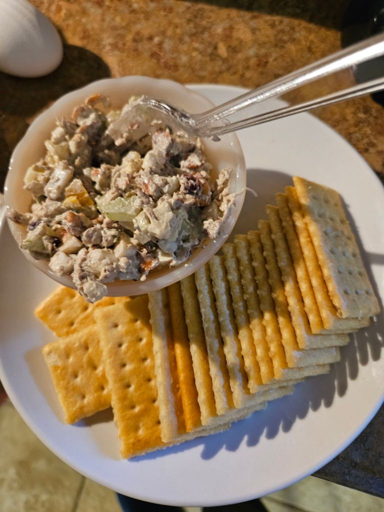 Last night I had one chicken thigh in the package I used for my paella dish. I boiled it and then removed the meat from the bone. I saved the broth to use at a different time. I mixed diced chicken, boiled and diced eggs, zuchinni relish, dried cranberries,celery diced, chopped pecans (from my earlier gathering), mayonaise, salt, pepper, and onion powder. This has a really good flavor and makes for a really good light lunch with butter crackers.