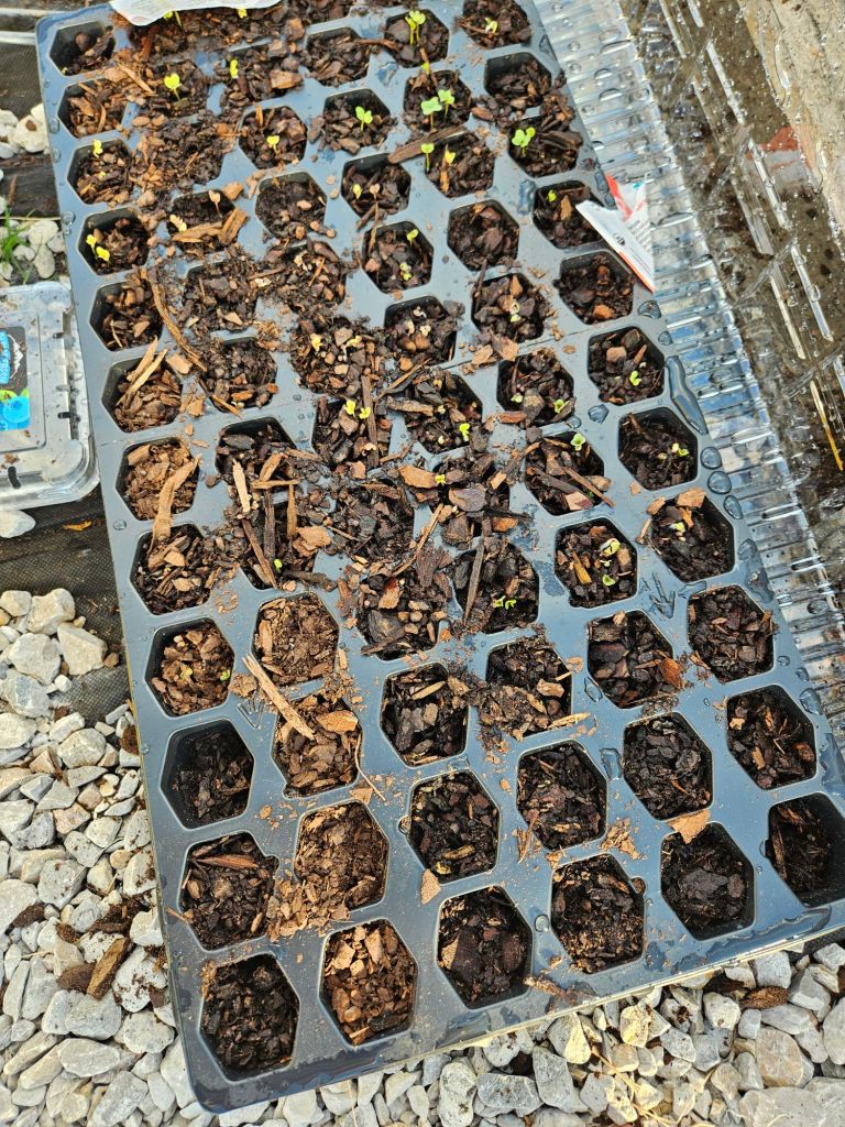 Look at the babies coming up. I am so excited. A few of the plants got some frost but have live root systems.