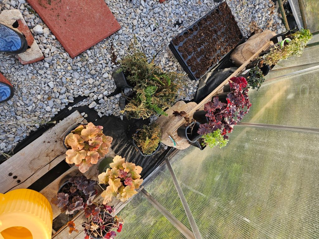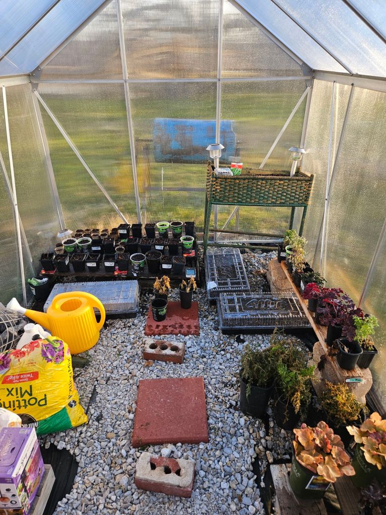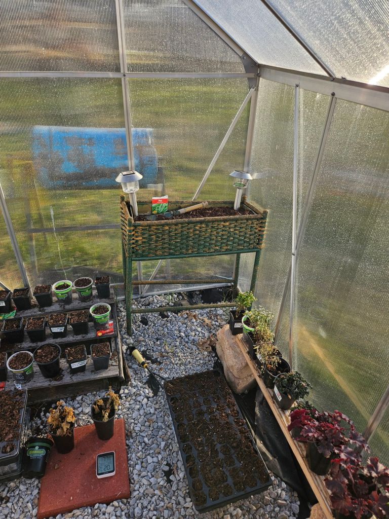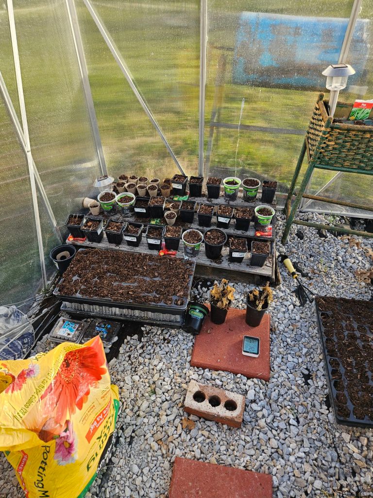 The snow has thawed and I got off work a little early. I stopped by the store and picked up quilt batting and potting soil. I went home to play in my greenhouse.