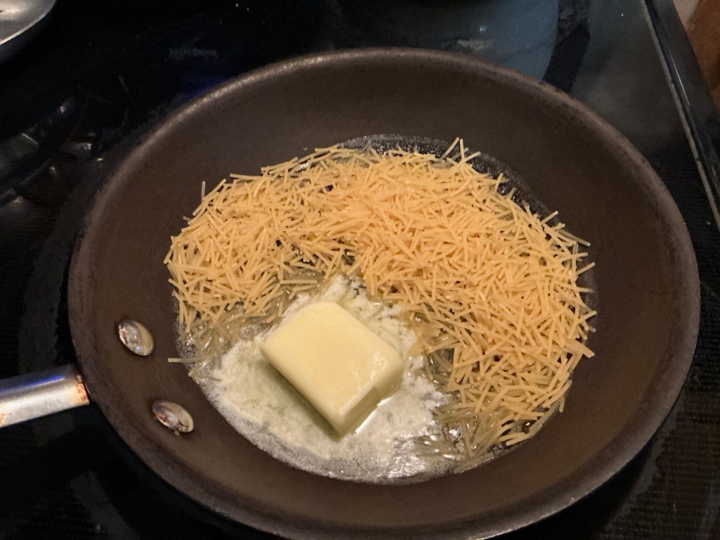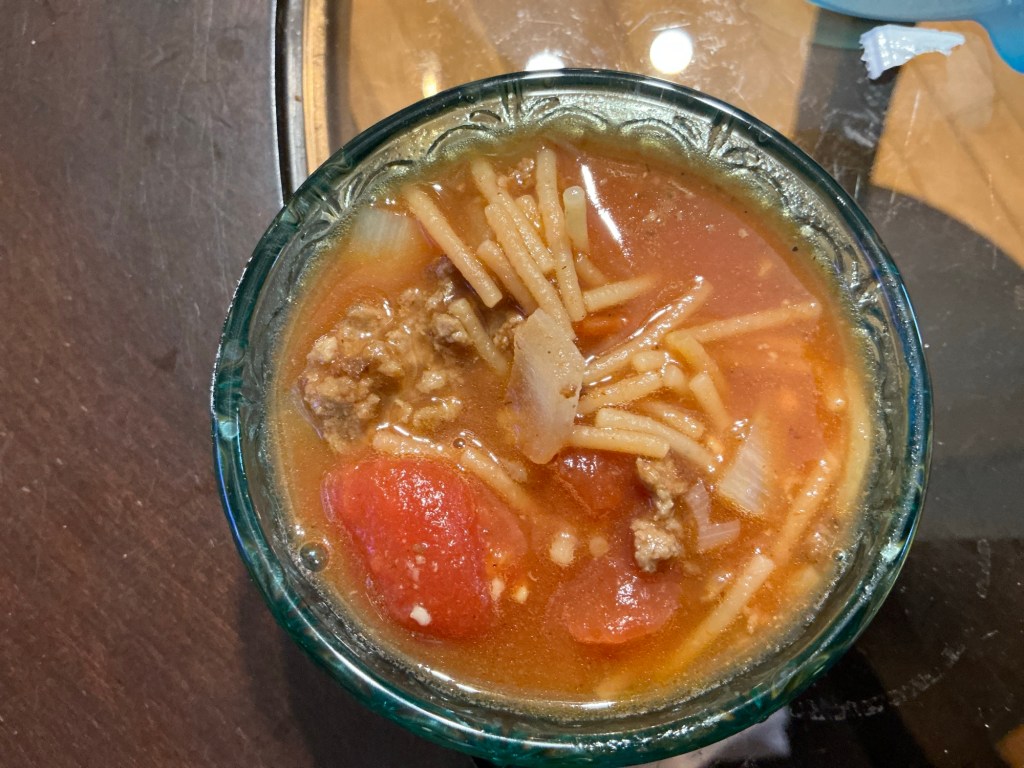 The ingredients for Fideo Soup are hamburger, onion, garlic, butter, Fideo pasta, jalapeño slices, tomatoes sauce, diced tomatoes, chicken broth, cumin, salt and pepper.
