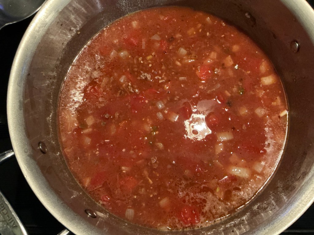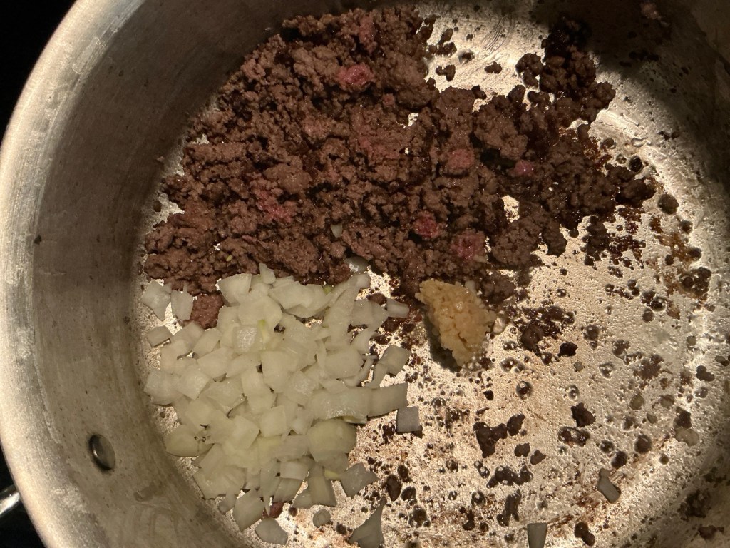 Brown your ground beef and add 1/2 an onion and some garlic. Add chopped jalapeño after the onions are translucent.