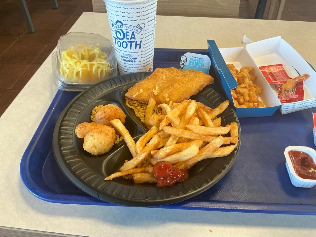 - Get myself some lunch at the Long John Silvers. I have a credit card reward and also a credit card 10 % off that I will be using. Lunch will be free for me today. I am very frugal. Done