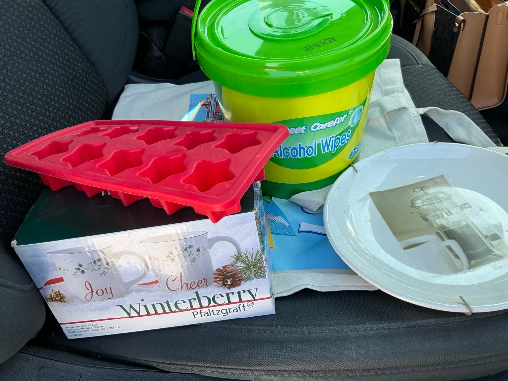 I pulled up to the huge sale on the roadside, and they had a table set up. Everything was $1. Wow. I can make some bath-bombs from the star molds and put them in the Christmas mugs for friends and co-workers. I have a coffee cart at my home and will be putting the decorative coffee plate in that area of my kitchen. I like using alcohol wipes in my housework. That was a good little haul. I also got some craft books that I might sell on Ebay. Total spent $35.